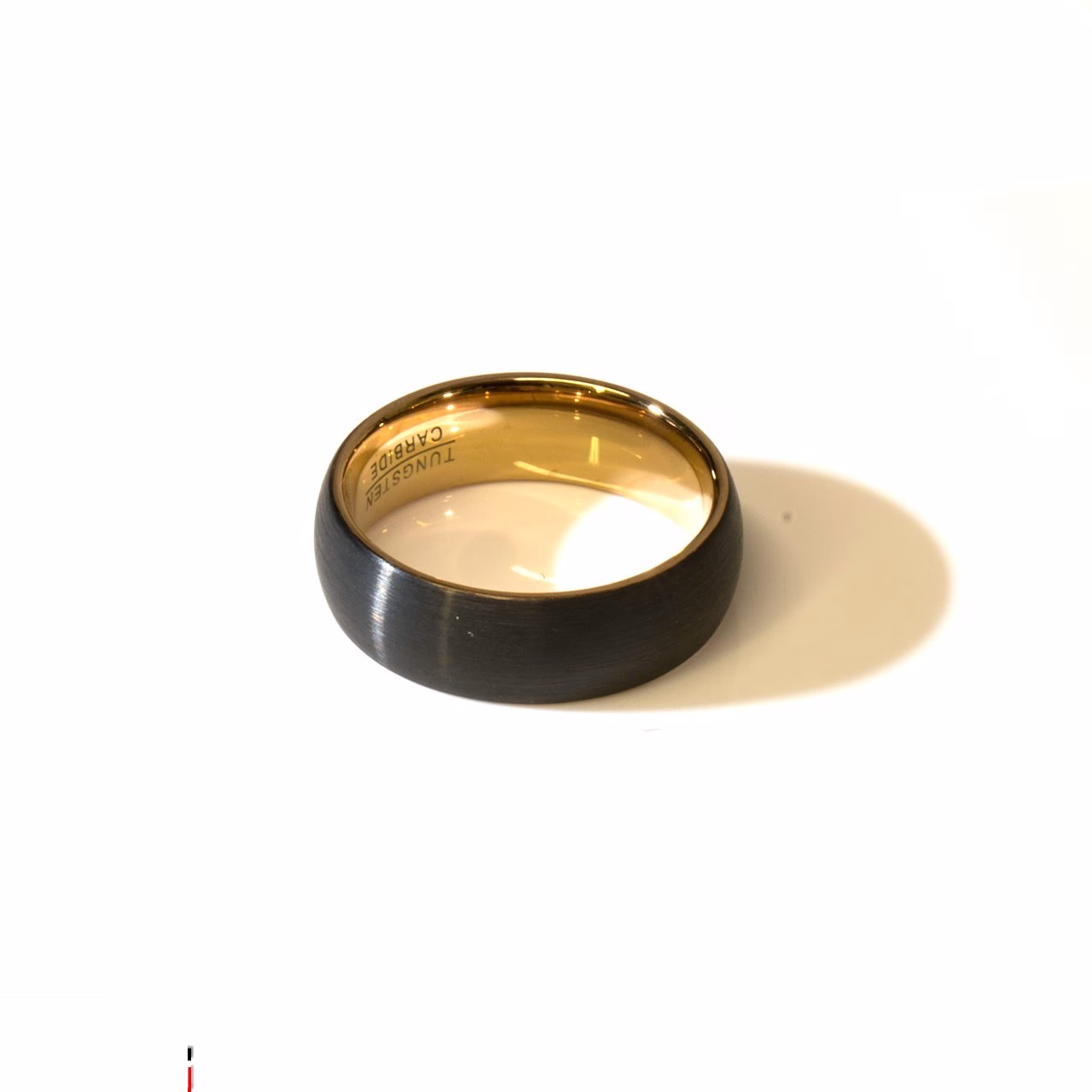 En tidløs, svart mattring med en indre ring i gull. Et lett slipemønster på utsiden av ringen.
